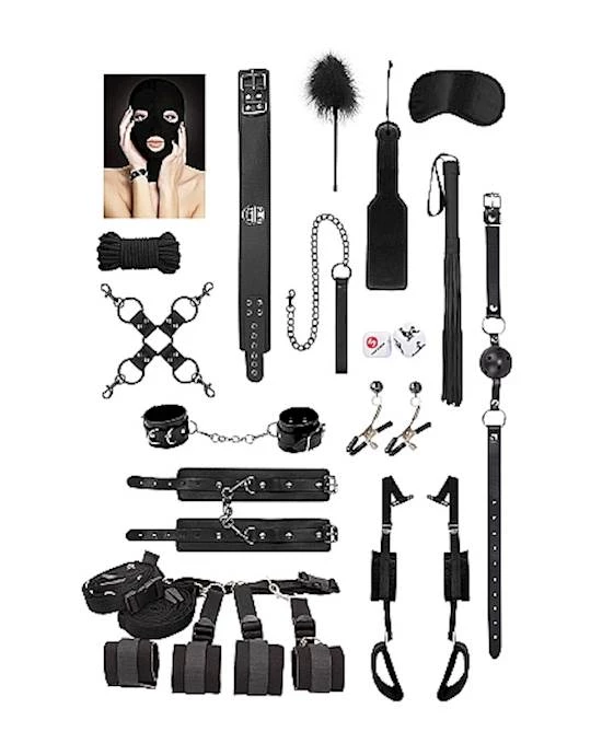 For those couples who want to step up their bondage games, this kit will satisfy even the most advanced bondage lovers. This kit comes with a breathable ball gag, bonded leather hand and leg cuffs, a satin eye mask, a flogger, an 11 inch feather tickler, a 10 meter Japanese silk rope, hogtie connector, nipple clamps, bonded leather collar and leash, 12 inch paddle, subversion mask, sex dice, door swing, and the ultimate bed restraint system!