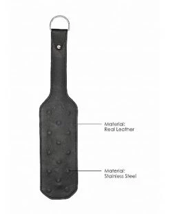 This kinky spanker is made of high-quality saddle leather and will give an extreme twist to all of your impact play fantasies. The Vampire Paddle is designed with 14 spiky studs to tease your sub’s anticipating body. It will bite into the skin to deliver intense sensations and it both looks and feels the part, in even the kinkiest of scenarios. The paddle has a total length 41cm (16″) including the handle of 15cm (5.9″). It has a width of 9cm (3.5″) and weighs a respectable 260 grams (9.2oz).