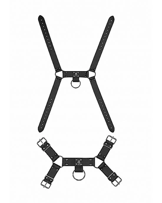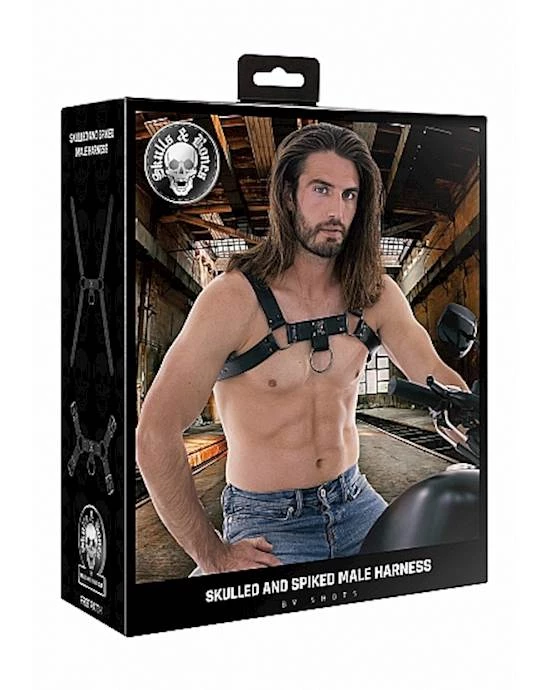 The Skulled and Spiked Male Harness is an upper body accessory that frames the torso for a fully strapped look showing off pectorals and shoulders to the max.