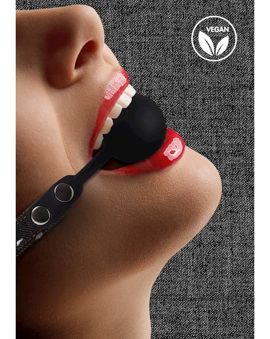 Place silicone ball in mouth and adjust denim straps around face to fit.
